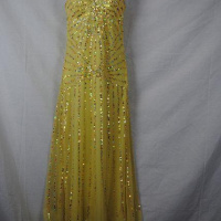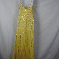 This is a Yellow Full Length Dress With Sequins Size 6. This item is used but is in great condition with no visible tears or stains.  Perfect for an evening out at a dance, formal, prom, wedding, homecoming, Bar / Bat Mitzvah, Quinceanera, or any other semi-formal occasion where you would feel comfortable wearing a gown or dress. Size: 6Fabric: 100% polyester.Brand:  Night Way Collections